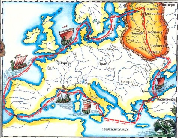 Воскресим маршрут древнего торгового пути «из варяг в греки», который проходил по главным дорогам того времени – Западной Двине и Днепру и соединял Балтийское море (Варяжское) с Черным (Понтийским или Русским). Западная Двина была известна древним грекам и римлянам и в давние времена называлась: Эридан, Рубон, Дуна, Дина. Уже со второй половины 3-го тысячелетия до н.э. по Зап. Двине и Днепру проходил янтарный торговый путь. Многочисленные письменные источники и археологические находки говорят, что в IX—XIII вв. н.э. по Зап. Двине и Днепру проходила одна из важнейших ветвей торгового пути «из варяг в греки», освоенная скандинавскими викингами. В начале викинги прошли маршрут Великого торгового пути, который вел через Финский залив – Ладожское озеро – реки Волхов – Ловать – Усвяча – Каспля – Днепровские волоки – в Днепр. А далее через Черное море можно было попасть в страны Средиземноморья. Почти одновременно начало функционировать Западнодвинское или Полоцкое направление Великого пути. С географической точки зрения полоцкий вариант пути был короче и выгоднее. В IX—X вв. сложилась разветвленная система трансевропейских водных путей. Территория Междуречья Днепра – Двины – Немана и Припяти привлекала внимание викингов. На восточно-славянских землях их называли варягами (от сканд. «клятва»). Присутствие норманнов на восточнославянских землях летопись отмечает под 859 г. Основным центром продвижения викингов на Восток была старошведская Бирка и город Висбю на острове Готланд. Оттуда по Двине и Днепру плыли торговые суда викингов – лучших воинов и торговцев Европы того времени. Морскую карту в помощь путешественникам в XVI в. создал шведский картограф Олаус Магнус. Наши земли он назвал Белой Русью.